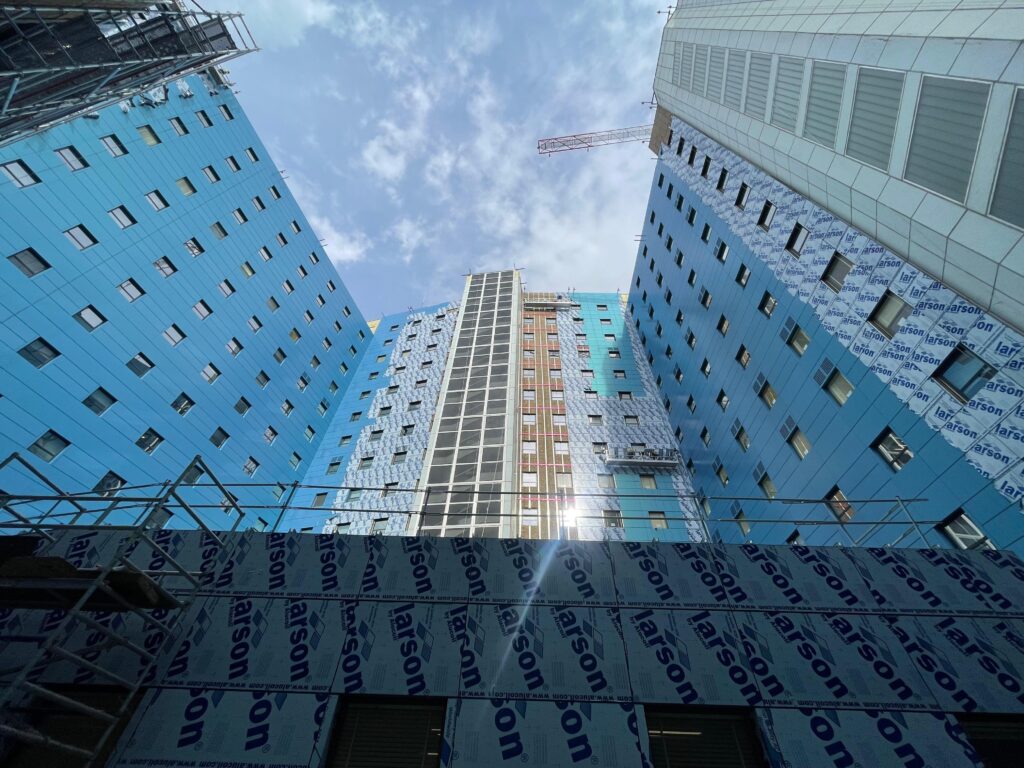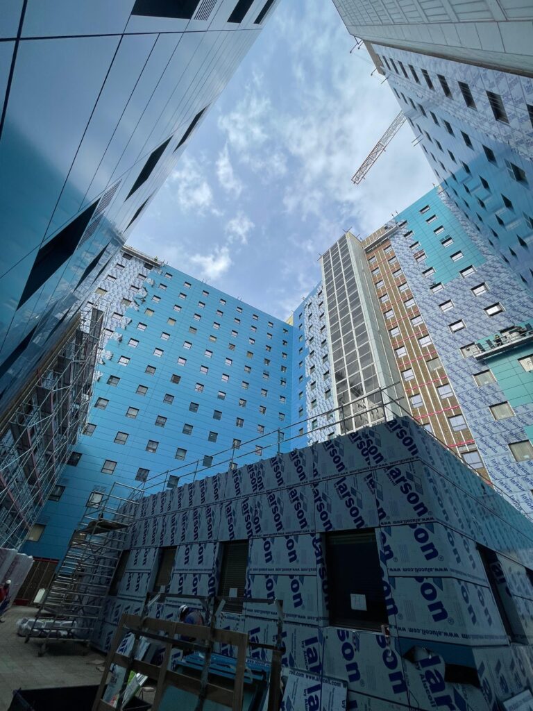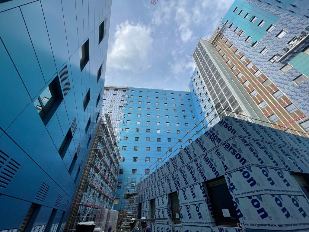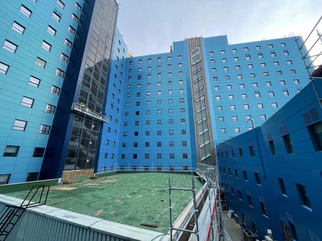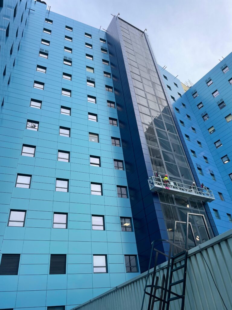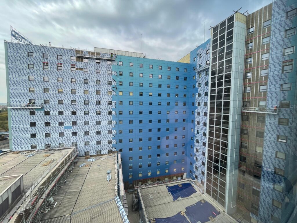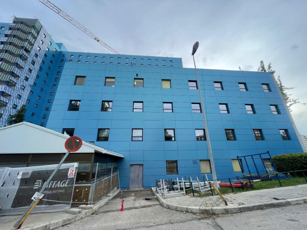 - La creación de nuevas fachadas ventiladas en el edificio principal, incluyendo la sustitución de carpinterías metálicas, garantizando la continuidad del funcionamiento hospitalario durante las obras.